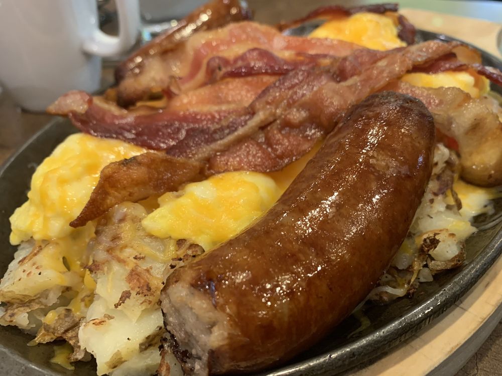 Two eggs any style topped with melted Monterey Jack cheese, with bacon, sausage, home fries and toast, served in a cast iron skillet